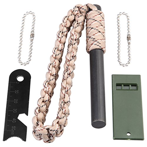 All images of Dimples Excel 6 in 1 Extra-Large 133g Firesteel Ferro Rod Fire Starter with, Mini Ruler, Bottle Opener, Serrated Edge, Rescue Whistle and Lanyard Woven by 108 inches Paracord (Desert Camo)
